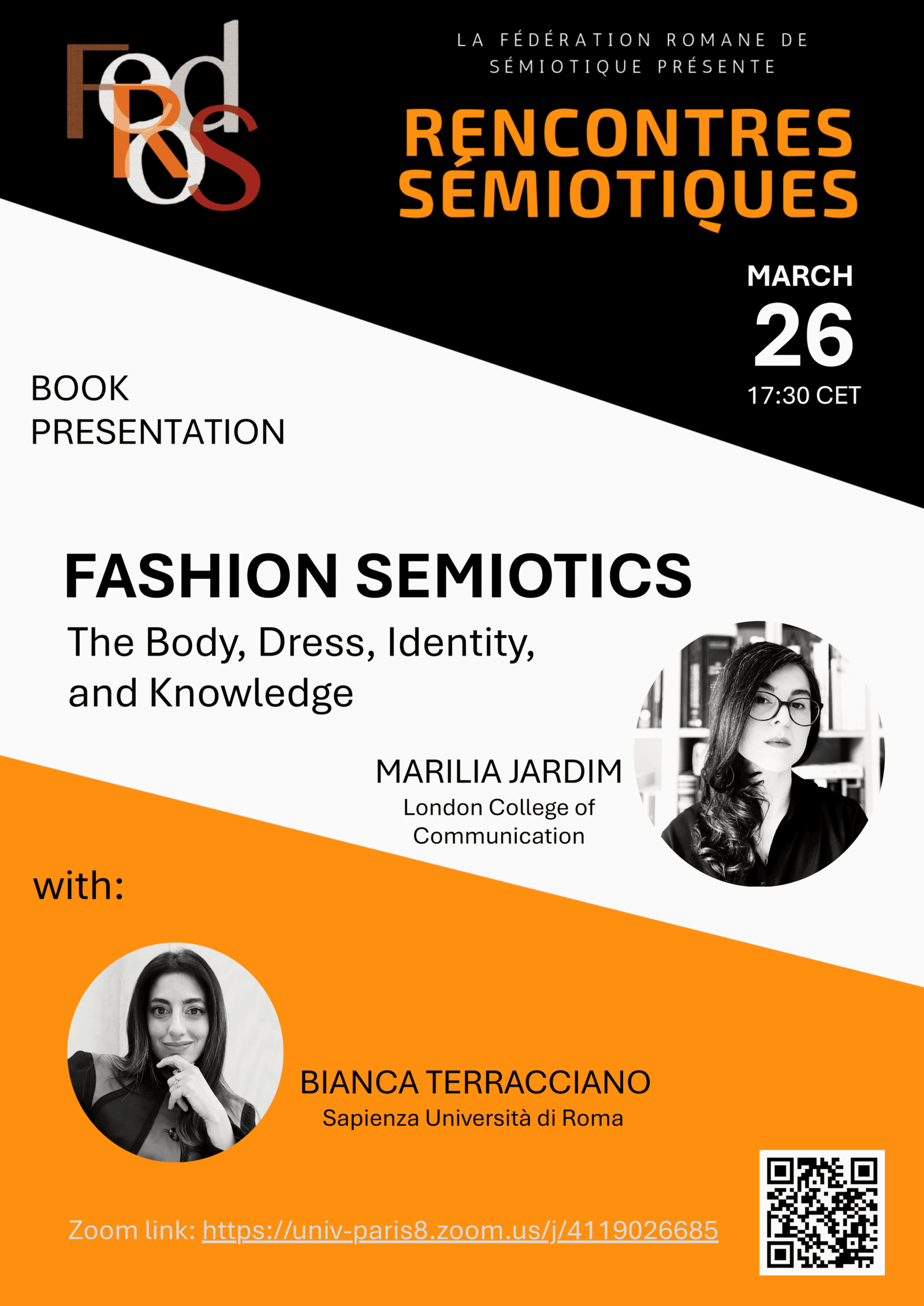 Cette rencontre se concentrera autour de l’ouvrage Fashion Semiotics. The Body, Dress, Identity, and Knowledge de Marília Jardim (London College of Communication) et nous aurons le plaisir de compter sur les commentaires de Bianca Terraciano (Sapienza Università di Roma).