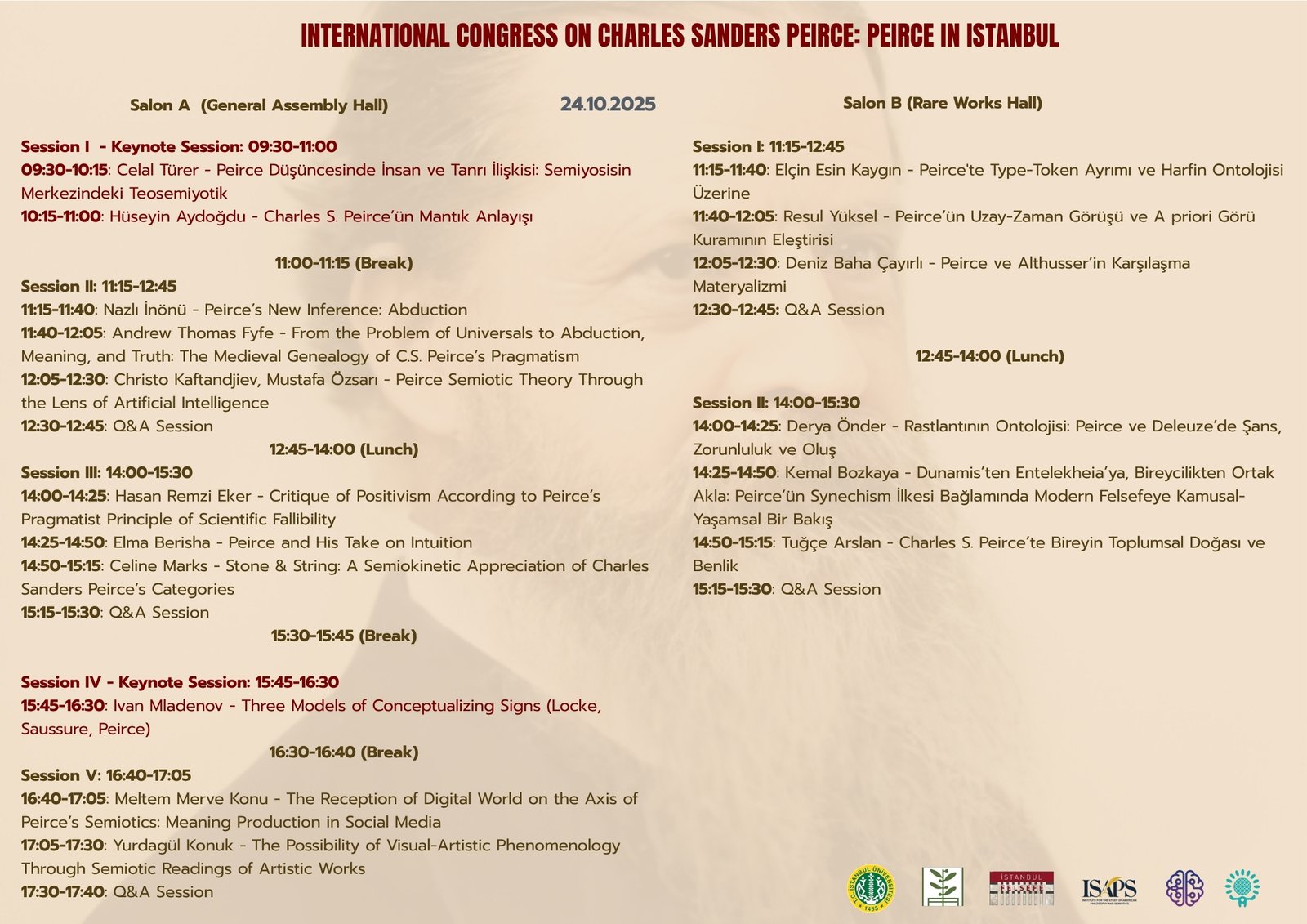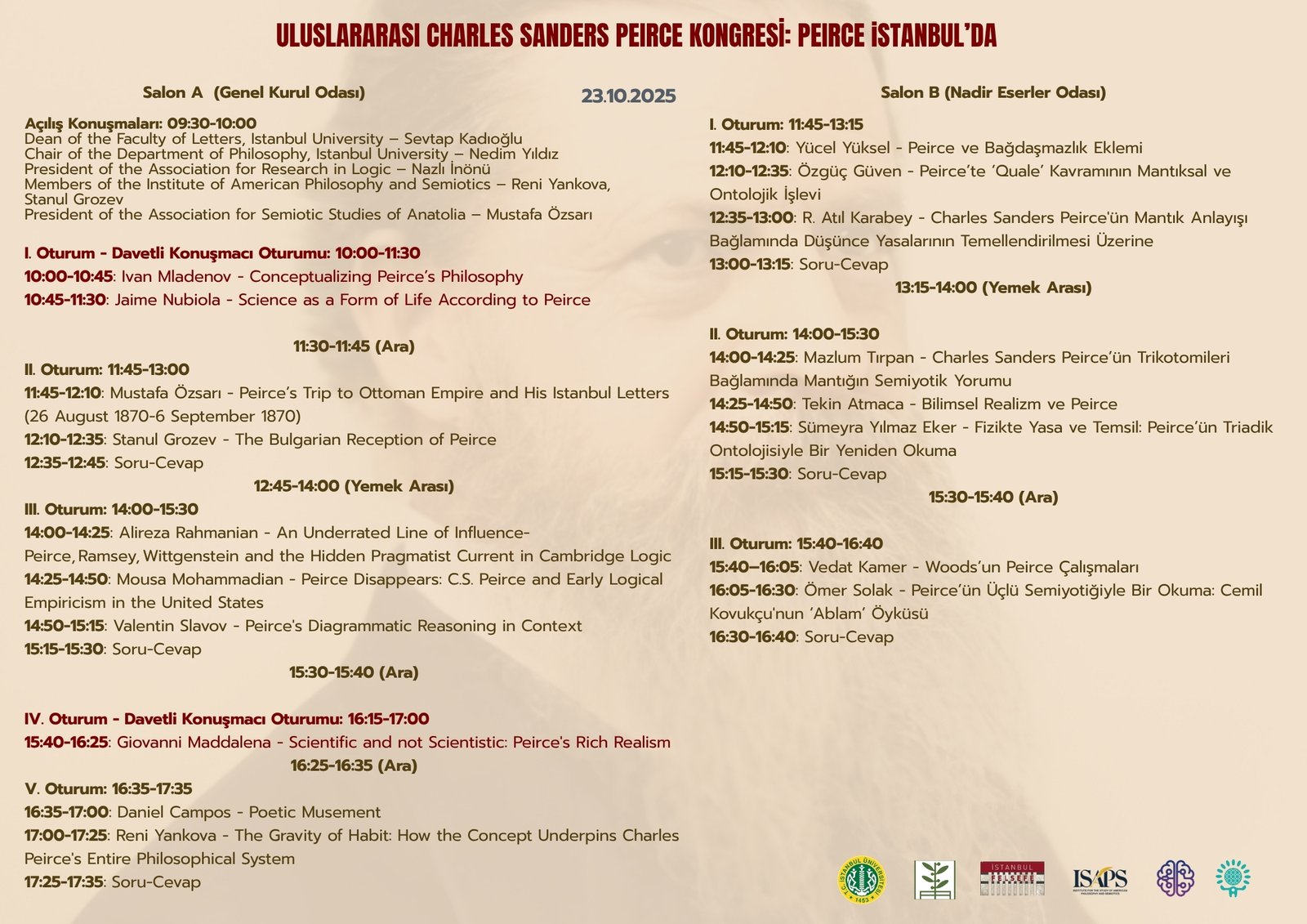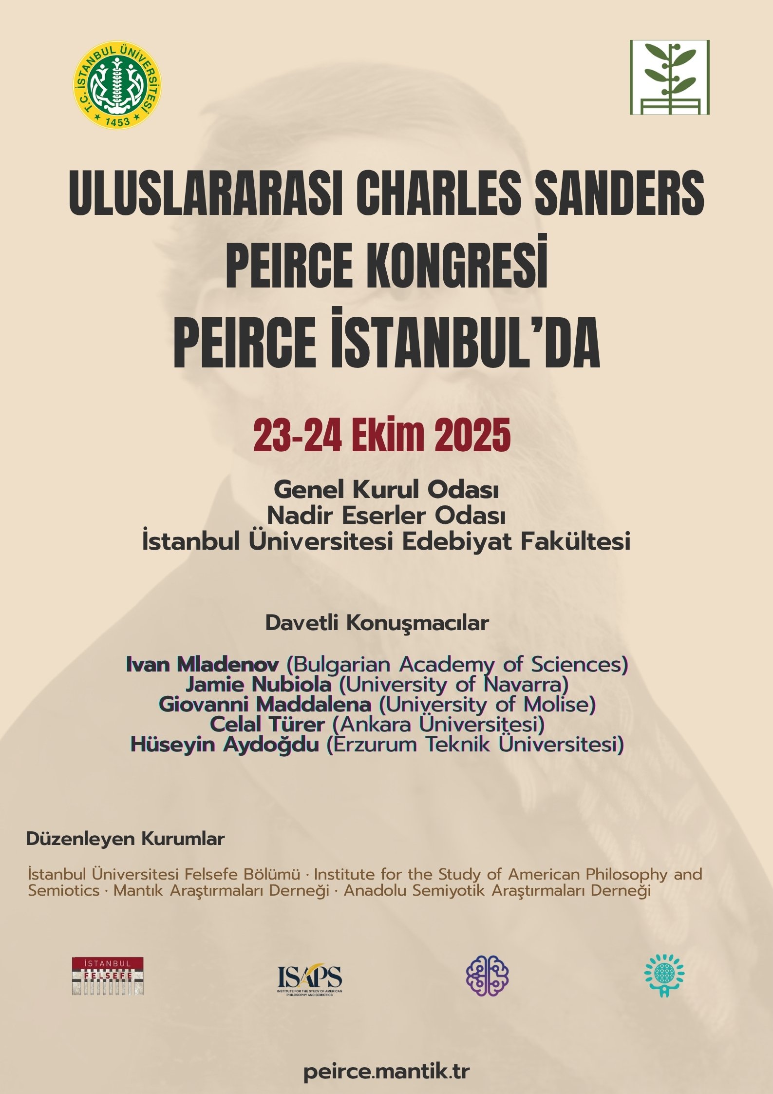 We are pleased to announce the International Peirce Symposium on Peirce in Istanbul, in collaboration with ISAPS (Sofia), AASS (Anotolian Association for Semiotics Studies), the Logic Research Association, and Istanbul University, on October 23-24, 2025, at Istanbul University.